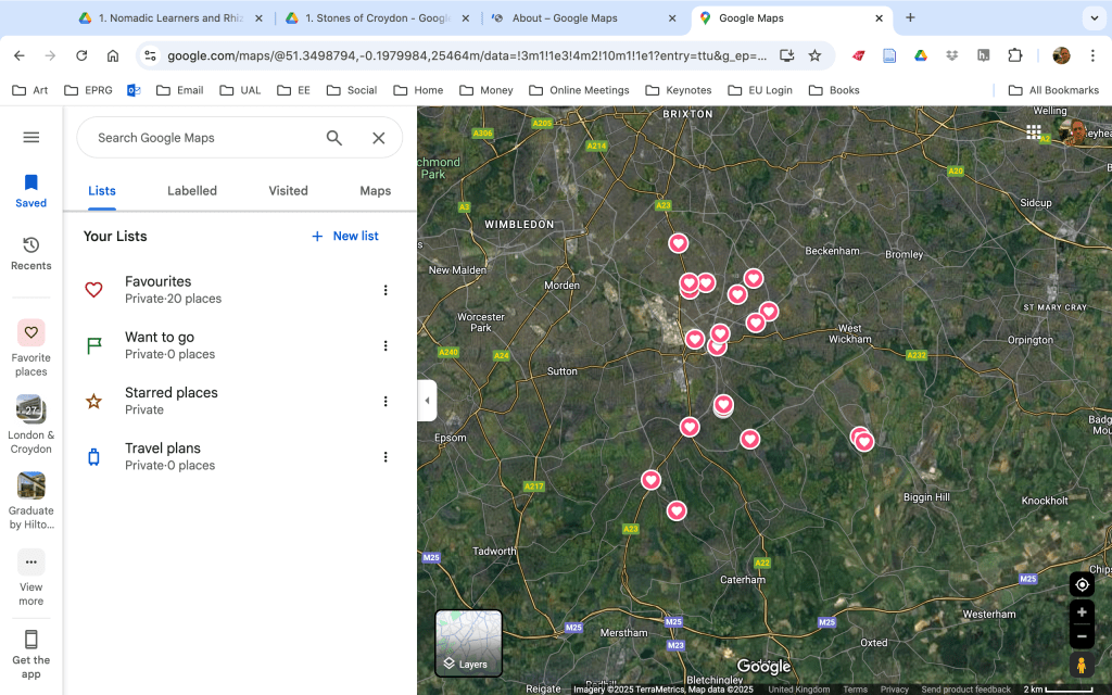 We have sensed that many things and peoples have been made invisible, ignored, vilified, disrespected, and made other. Colonisers draw borders to control and keep themselves in power. Monuments have been built to celebrate in-humanity, and still stain. Others lay desolate and uncelebrated waiting to be listened to. We have been listening to the Stones of Croydon. They speak to us, and we are starting to be with each other. Leroy Little Bear, Blackfoot elder and educator taught us that the exchange of conversation must be between all the creatures and plants and spirits that connect us to and with the earth. He said, think of their age, the stuff they must know! Yet they are careful about sharing their counsel. Like a stranger, they will not sit down and tell you everything immediately, only when the rocks begin to know you, will they tell their story. The 20 Stones did not tell us their story immediately. We encountered them on our walks through the terrains of South London. Their out-of-placeness first struck as being strange. They had been scarred by a plaque that told us a story of one of their migrations. It said This Stone was placed here in 2015 to commemorate the 50th anniversary of the formation of the London Borough of Croydon. The stones had other stories to tell. The felt abused, fragmented from each other, and wanted to return to the strata they had be hacked from. They asked us for our help. They became a part of the NDA. They had many strange requests. Some wanted bright pink tutus around their bases, others want wheels and ornate legs to help them escape their imposed stasis. They all want to float, be elevated and be celebrated as themselves and not as markers of the scars that human made borders create. Together we propose to do these things and more.